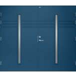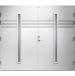 Garagedörr i modern stil med sparsam dekor. Två smala, stående klarglas. Som standard är dörren Vit (NCS S0502-Y).