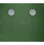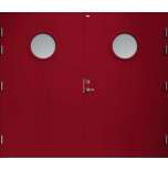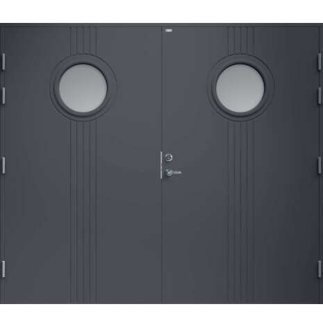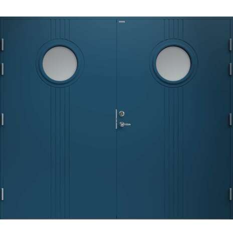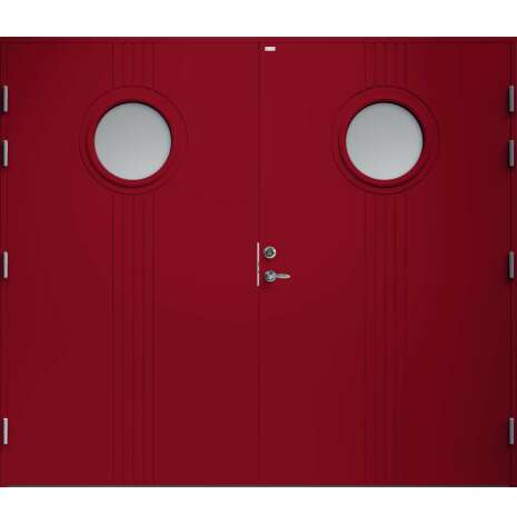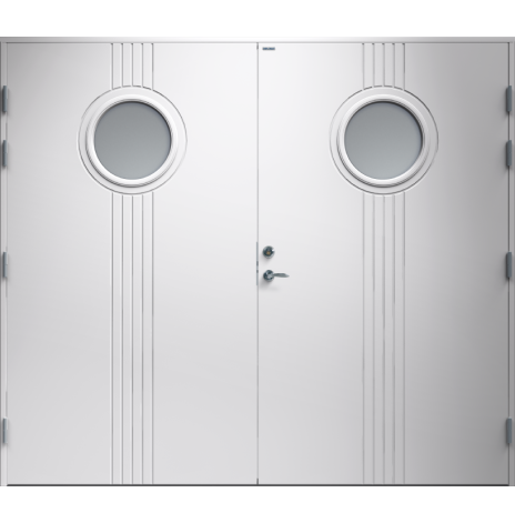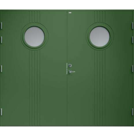 Garagedörr i traditionell stil med spårfräst dekor och två runda klarglas. Som standard är dörren Vit (NCS S0502-Y).