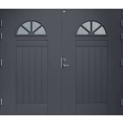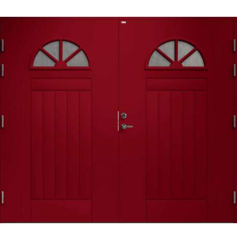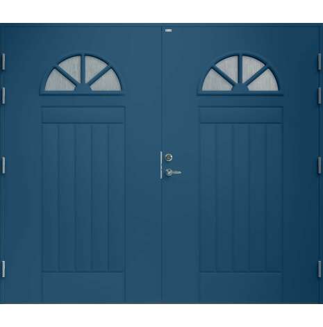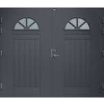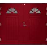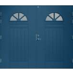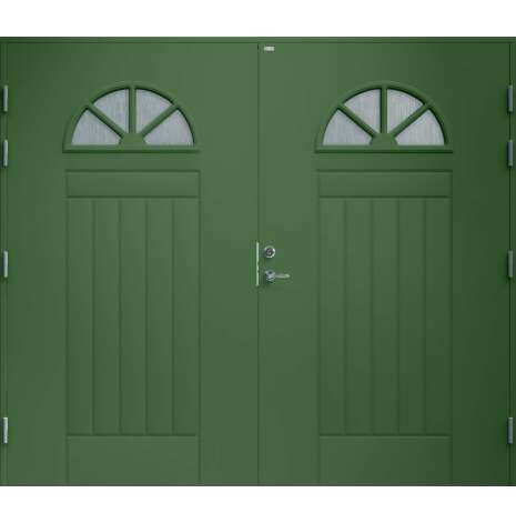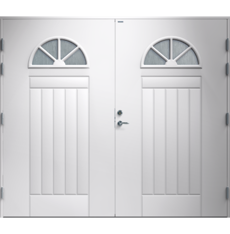 Garagedörr i klassisk stil med spårfräst dekor samt två halvcirkelformade cotswoldglas med dekorspröjs. Som standard är dörren Vit (NCS S0502-Y).