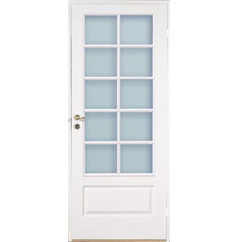 Formpressad innerdörr med klassiskt utseende och härdat klarglas med dekorspröjs. Vitmålad som standard men finns också i valfri kulör.