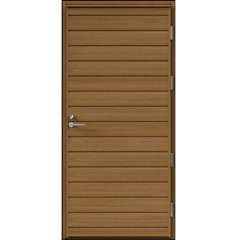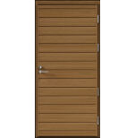 Dörrarna är klädda ut- och invändigt med kvistfri, massiv furupanel och lasyrbehandlade i valfri standardkulör. Levereras utan beslag. U-värde från 0,71.