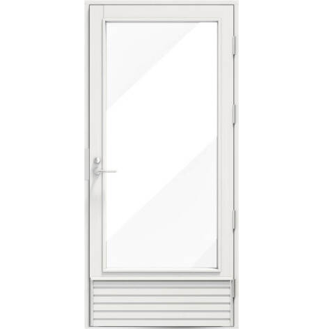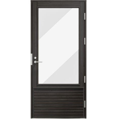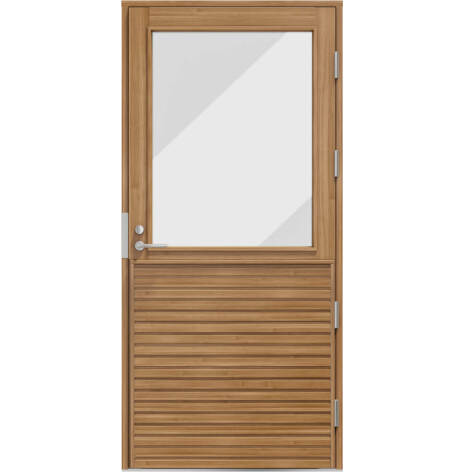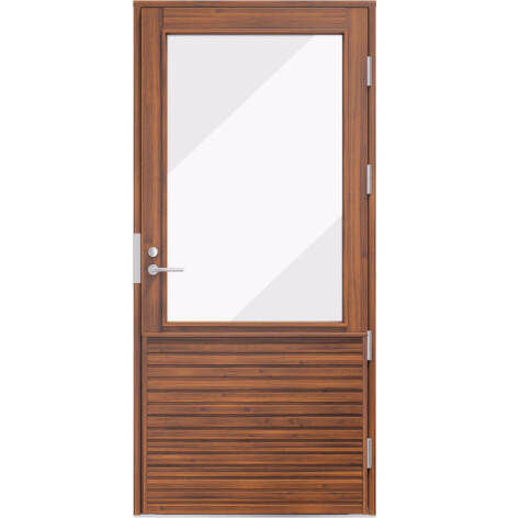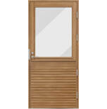 Dörrarna är klädda ut- och invändigt med kvistfri, massiv furupanel och lasyrbehandlade i valfri standardkulör. Levereras utan beslag. U-värde från 0,71.