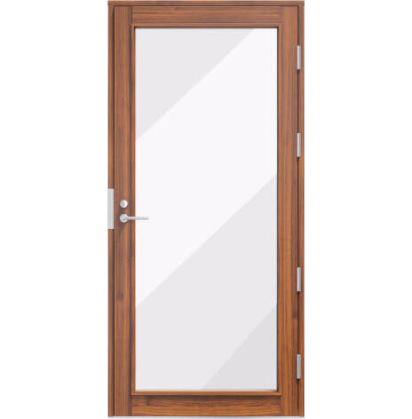 Dörrarna är klädda ut- och invändigt med kvistfri, massiv furupanel och lasyrbehandlade i valfri standardkulör. Levereras utan beslag. U-värde från 0,71.
