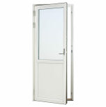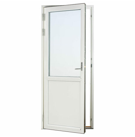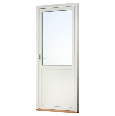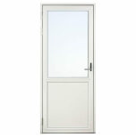 Dessa dörrar har en glasruta upptill med bröstning och isolerad fyllning i underkant. Det gör att glasrutans nedre kant bör linjera med fönster som sitter i anslutning till dörren. Du kan därmed välja om bröstningen ska matcha med fasta eller öppningsbara fönster. Har du t.ex. ett fast fönster med Modulhöjd 13 (=128 cm) brevid dörren väljer du Fast 13 som bröstning osv..