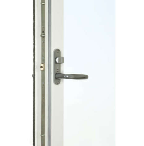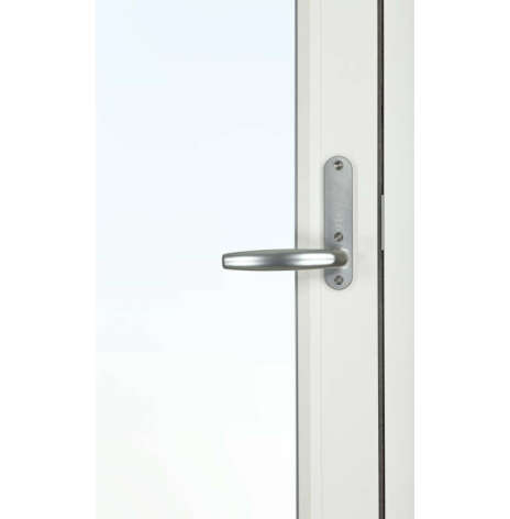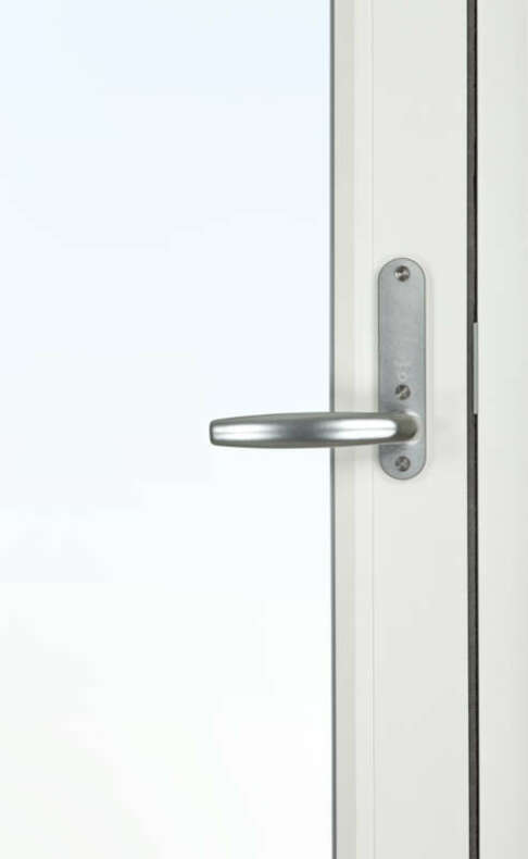 Fönsterdörrarna, som har fallkolvsspanjolett (handtaget fjädrar tillbaka när du släpper det – precis som på en vanlig dörr) och fyrpunktslåsning som försvårar vid inbrottsförsök. Dörren är försedd med vred på insidan och täckbricka på utsida.