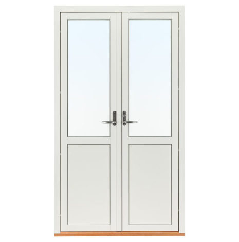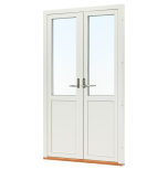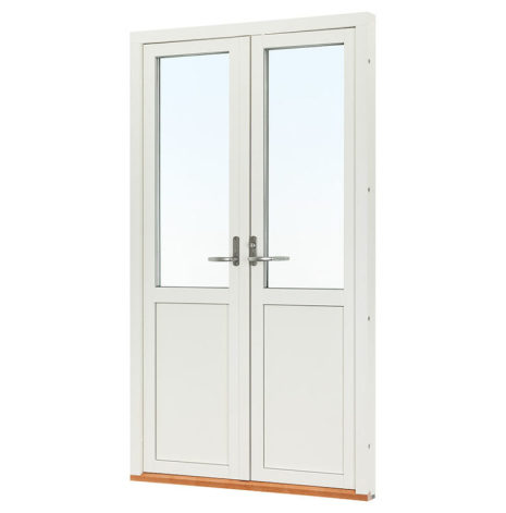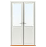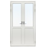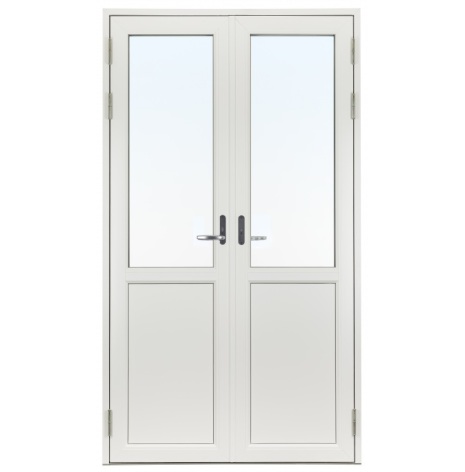 Dessa dörrar har en glasruta upptill med bröstning och isolerad fyllning i underkant. Det gör att glasrutans nedre kant bör linjera med fönster som sitter i anslutning till dörren. Du kan därmed välja om bröstningen ska matcha med fasta eller öppningsbara fönster. Har du t.ex. ett fast fönster med Modulhöjd 13 (=128 cm) brevid dörren väljer du Fast 13 som bröstning osv..
