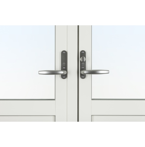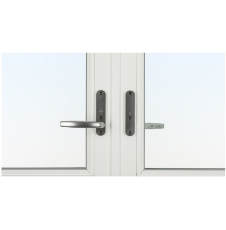 Fönsterdörrarna har en fallkolvsspanjolett på den aktiva dörren som gör att handtaget fjädrar tillbaka när du släpper det – precis som på en vanlig dörr. Säkerheten är mycket hög, men du kan, om du vill, uppgradera till en högre nivå. Dörren levereras som standard med låsvred på insidan, men kan beslås med olika låsalternativ, se mer under våra tillval.