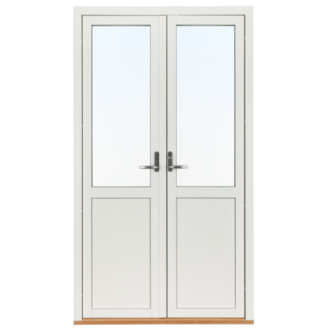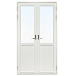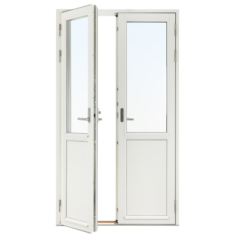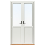 Dessa pardörrar har en glasruta upptill och sedan bröstning. Det gör att glasrutans nedre kant bör linjera med fönster som sitter i anslutning till dörren. Du kan därmed välja om bröstningen ska matcha med fasta eller öppningsbara fönster.