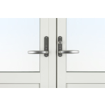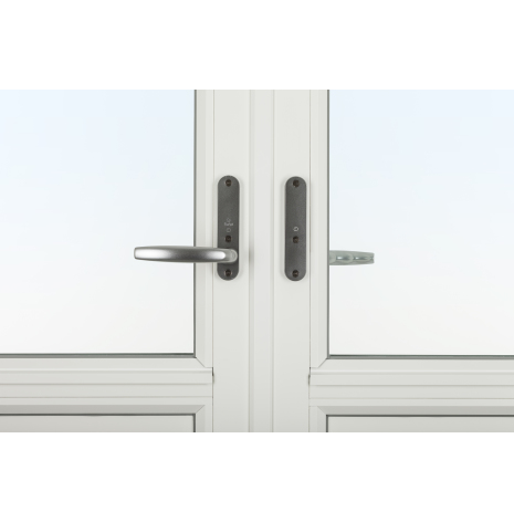 Fönsterdörrarna har en fallkolvsspanjolett på den aktiva dörren som gör att handtaget fjädrar tillbaka när du släpper det – precis som på en vanlig dörr. Säkerheten är mycket hög, men du kan, om du vill, uppgradera till en högre nivå. Dörren levereras som standard med låsvred på insidan, men kan beslås med olika låsalternativ, se mer under våra tillval.