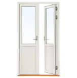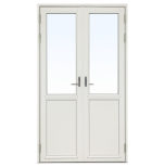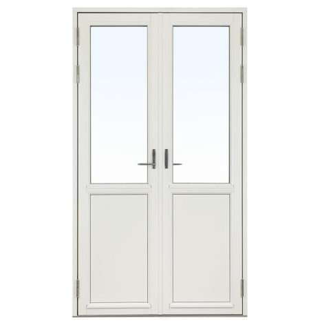 Dessa pardörrar har en glasruta upptill och sedan bröstning. Det gör att glasrutans nedre kant bör linjera med fönster som sitter i anslutning till dörren. Du kan därmed välja om bröstningen ska matcha med fasta eller öppningsbara fönster.