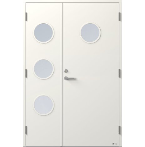 Kvalitetsytterdörr från NorDan - Bor parytterdörr - Planeten 836PG1+3, med ett runt glas i gångdörren och 3 runda glas i det passiva dörrbladet. Svensktillverkade ytterdörrar av robust konstruktion med dubbla stålplåtar, extra klimatpackning samt kraftig, 56x105 mm, lamell-limmad, fingerskarvad och vakuumimpregnerad karm. Ytterdörren levereras med låskista ASSA 2002, utan cylinder och trycke. Handikappvänlig kantregel för enkel öppning och låsning av det passiva dörrbladet.