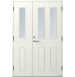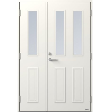 Kvalitetsytterdörr från NorDan - Bor parytterdörr - St.Andrews 869G2. Dörren har 2 glas i gångdörren och 1 glas i den passiva dörren. Den utvändiga dekoren följer glasens form. Möjlighet att välja invändig dekor. Svensktillverkade ytterdörrar av robust konstruktion med dubbla stålplåtar, extra klimatpackning samt kraftig, 56x105 mm, lamell-limmad, fingerskarvad och vakuumimpregnerad karm. Ytterdörren levereras med låskista ASSA 2002, utan cylinder och trycke. Handikappvänlig kantregel för enkel öppning och låsning av det passiva dörrbladet.