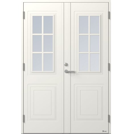 Kvalitetsytterdörr från NorDan - Bor parytterdörr - Vega 835PG är en klassiskt spårfräst spegeldörr med glas i båda dörrbladen med utvändig, löstagbar spröjs (2 liggande, 1 stående). Svensktillverkade ytterdörrar av robust konstruktion med dubbla stålplåtar, extra klimatpackning samt kraftig, 56x105 mm, lamell-limmad, fingerskarvad och vakuumimpregnerad karm. Ytterdörren levereras med låskista ASSA 2002, utan cylinder och trycke. Handikappvänlig kantregel för enkel öppning och låsning av det passiva dörrbladet.