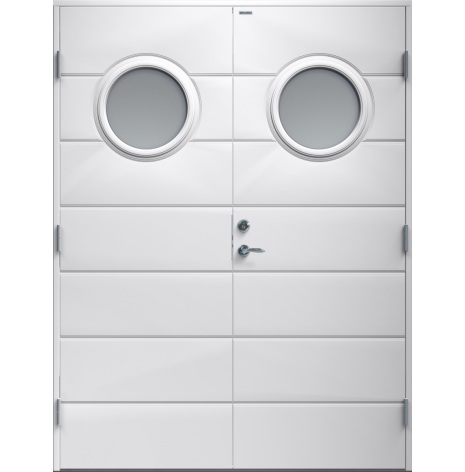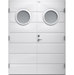 Bella är en parytterdörr i traditionell stil med liggande dekor och runt klarglas. Insidan är slät, men går att få dekorerad som utsidan. Dörrar och karm levereras vit NCS S 0502-Y som standard.