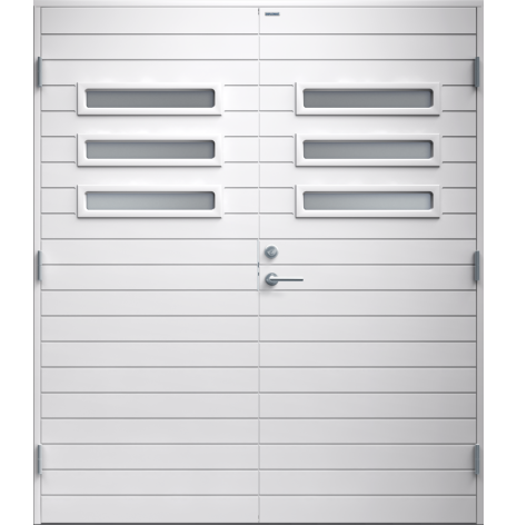 Ingela glas är en parytterdörr i modern stil med tre horisontella klarglas på varje dörrblad. Spårfräst dekor i form av liggande panel. Finns i ek, konstteak eller valfri kulör. Insidan är slät, men går att få dekorerad som utsidan. Dörr och karm levereras vit NCS S 0502-Y som standard.