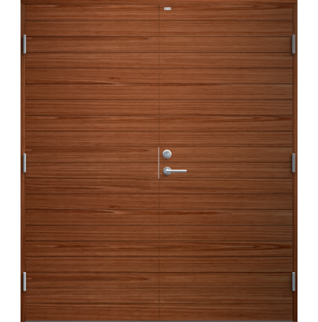 Ingela tät Teak är en parytterdörr i modern stil med spårfräst dekor i form av liggande panel i konstteak. Insidan är slät, men går att få dekorerad som utsidan.
