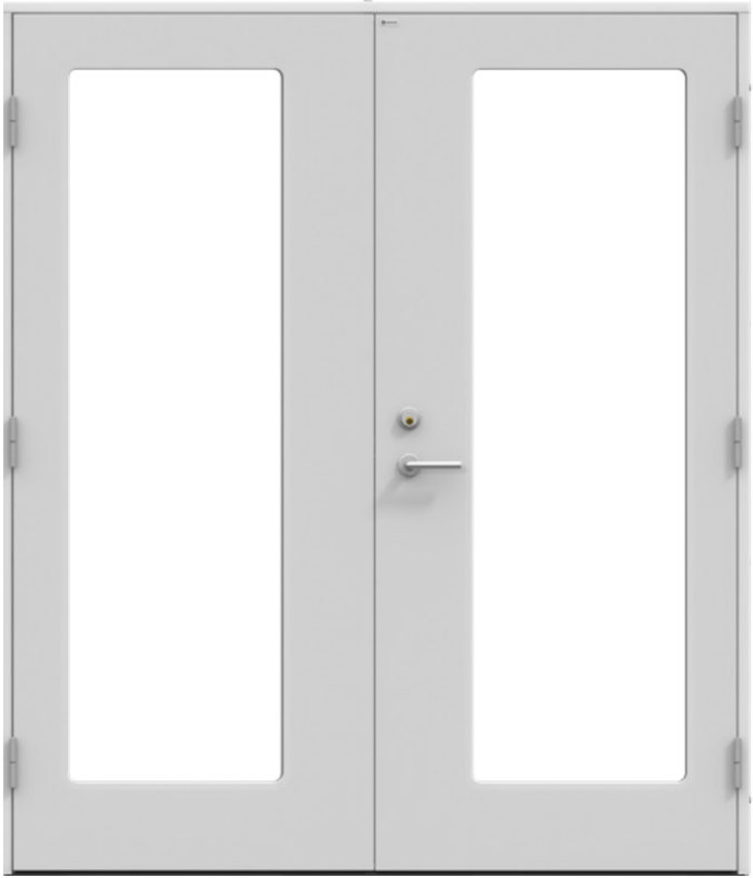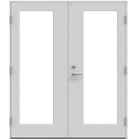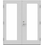 Elegant parytterdörr med två stort glaspartier som har rundade hörn och är förskjutna mot gångjärnssidorna. Extreme innebär att dörren är byggd på laminatskiva som är mer väderbeständig och formstabil. Ett extra slitstarkt utförande för att motstå tuffa påfrestningar.