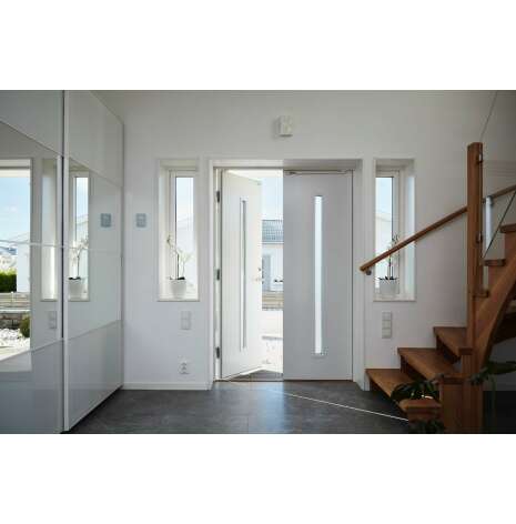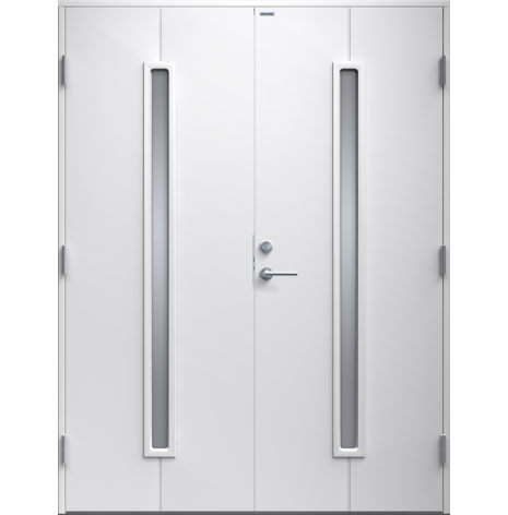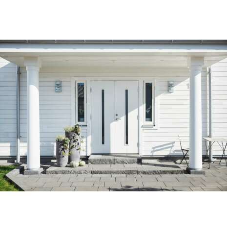 Maj är en ytterdörr i modern stil med sparsmakad dekor och smalt, stående klasglas. Insidan är slät, men går att få dekorerad som utsidan. Dörr och karm levereras vit NCS S 0502-Y som standard.