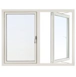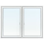 Svenska Fönster Sideswing Rak Profil (fd Traryd Optimal) med vitmålat trädelar på insidan i kulören NCS S 0502-Y och klädd utsida i mattlackerad aluminium vit Ral 9010 som standard, men kan också fås med ett antal standardkulörer på utsidan utan tilläggskostnad.Tvåluft innebär två separata bågar som går att öppna var för sig i samma karm.