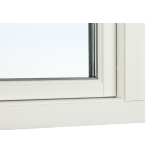 Svenska Fönster Sidohängt Fönster Rund Profil (fd SP Balans) med vitmålat trädelar på insidan i kulören NCS S 0502-Y och klädd utsida i mattlackerad aluminium vit Ral 9010 som standard, men kan också fås med ett antal standardkulörer på utsidan utan tilläggskostnad.