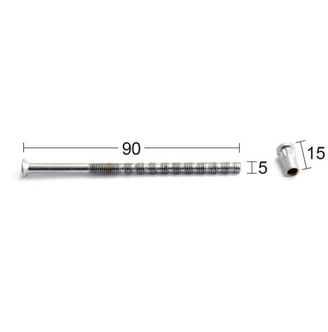 Klippbar 90 mm skruv med hylsmutter av mässing för cylindervred och dörrhandtag. Gänga M5. Levereras i 2-pack