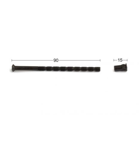 Klippbar 90 mm skruv med hylsmutter av mässing för cylindervred och dörrhandtag. Gänga M5. Levereras i 2-pack