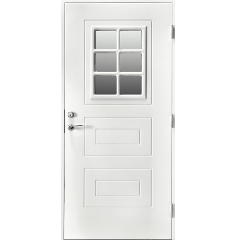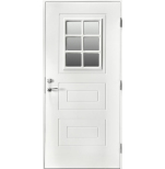 Br.Johansson SY103 är en vit ytterdörr med spårfräst dekor samt ett fönster med klarglas och dekorspröjs.