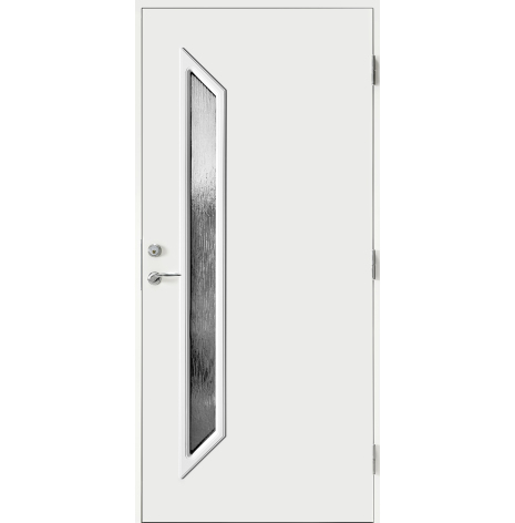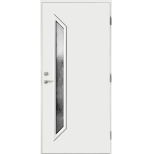 Br.Johansson SY108 är en slät vit ytterdörr med ett smalt avlångt klarglas.