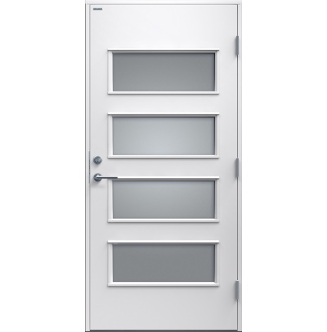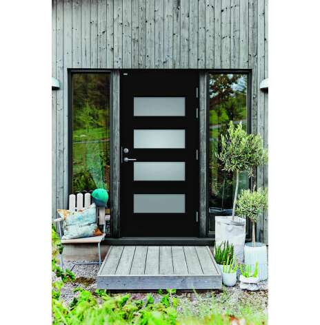 Ebba är en elegant ytterdörr helt utan dekor på in och utsida. Dörren har fyra lite större, liggande klarglas. Välj mellan valfri kulör, konstteak eller ek. Dörr och karm levereras vit NCS S 0502-Y som standard.