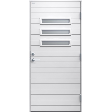 Ingela glas är en ytterdörr i modern stil med tre horisontella klarglas. Spårfräst dekor i form av liggande panel. Finns i ek, konstteak eller valfri kulör. Insidan är slät, men går att få dekorerad som utsidan. Dörr och karm levereras vit NCS S 0502-Y som standard.