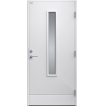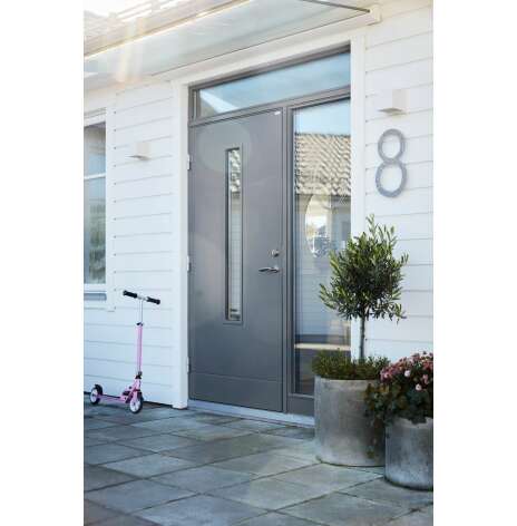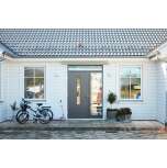 Laila glas är en ytterdörr i modern stil, helt slät utan dekor med smalt, stående klarglas. Finns i ek, konstteak eller valfri kulör. Dörr och karm levereras vit NCS S 0502-Y som standard.