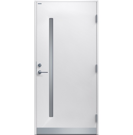 Mikaela är en ytterdörr i modern stil med slät yta helt utan dekor. Smalt, stående klarglas och rostfri sparkplåt. Dörr och karm levereras vit NCS S 0502-Y som standard.