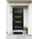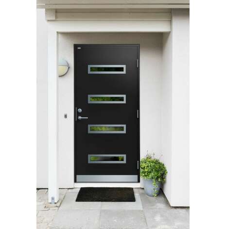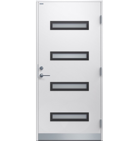 Minnah är en ytterdörr i modern stil utan dekor. Byggd på laminatskiva som är extra väderbeständig och formstabil. Fyra liggande klarglas i steppat utförande med limmad glaskassett, glasram i svart eller silver. Rostfri sparkplåt. Extreme innebär att dörren är byggd på laminatskiva som är mer väderbeständig och formstabil. Ett extra slitstarkt utförande för att motstå tuffa påfrestningar. Dörr och karm levereras vit NCS S 0502-Y som standard.