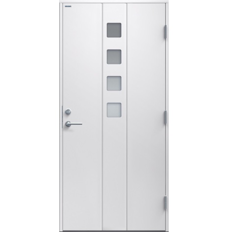 Sandra är en Ytterdörr i modern stil och dekorspår med djup profil i 6mm HDF-skiva. Fyra små, kvadratiska klarglas. Insidan är slät, men går att få dekorerad som utsidan. Dörr och karm levereras vit NCS S 0502-Y som standard.