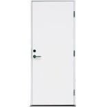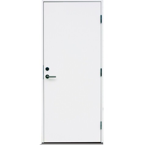 Dörren har slät ut- och insida. Stomme i furu med fyllning av 55 mm polystyren. Aluminiumplåt på bägge sidor för bra formstabilitet och vitmålad HDF-board (3,2 mm) som ytskikt. 3 st justerbara gångjärn med bakkantssäkring. Levereras med låskista Assa 8765 och justerbart slutbleck.Tjocklek på dörrblad 62 mm. Färdigmonterad karm i vitmålad furu 42x92 mm med handikappanpassad tröskel och förborrade karmskruvshål. OBS: Karmskruv ingår ej.