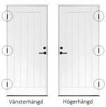 Tänk på vilken hängning dörren ska ha för att fungera bäst hos just dig. Dörrens hängning avgörs beroende på vilken sida gångjärnen är placerade. Du ska se gångjärnen från utsidan, sitter gångjärnen på vänster sida är dörren vänsterhängd. sitter det på höger sida så är den högerhängd.