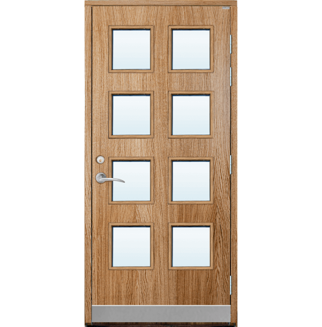 Våra Ek- och Teak-dörrar har en kraftig stomme med dubbelt ramträ, precis som våra andra dörrar. Ekdörrar är fanerade med Ek av A-kvalitet på in- och utsida. Teakdörrar är fanerade med Teak av A-kvalitet på utsidan och Teakinfärgat fanér på insidan. Dörrbladen har massivt ramträ i Ek/brunlaserad Ek. Karmen är gjord av massiv ek med mycket hög kvalitet. Tröskeln är i slitstark hårdträ med slitskena.