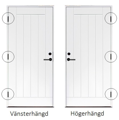 Tänk på vilken hängning dörren ska ha för att fungera bäst hos just dig. Dörrens hängning avgörs beroende på vilken sida gångjärnen är placerade. Du ska se gångjärnen från utsidan, sitter gångjärnen på vänster sida är dörren vänsterhängd. sitter det på höger sida så är den högerhängd.