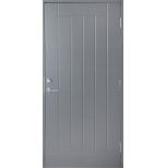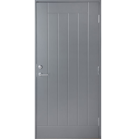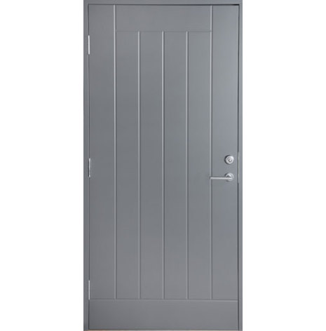 Dörren har ett spårfräst mönster på utsidan med slät insida. Stomme i furu med fyllning av 55 mm polystyren. Aluminiumplåt på bägge sidor för bra formstabilitet och gråmålad HDF-board (3,2 mm) som ytskikt. 3 st justerbara gångjärn med bakkantssäkring. Levereras med låskista Assa 8765 och justerbart slutbleck.Tjocklek på dörrblad 62 mm. Färdigmonterad karm i gråmålad furu 42x92 mm med handikappanpassad tröskel och förborrade karmskruvshål. OBS: Karmskruv ingår ej.