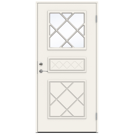 Satie har dekorlister på utsidan och är slät på insidan. Karm och Dörrblad målade i NCS S0502-Y som standard.