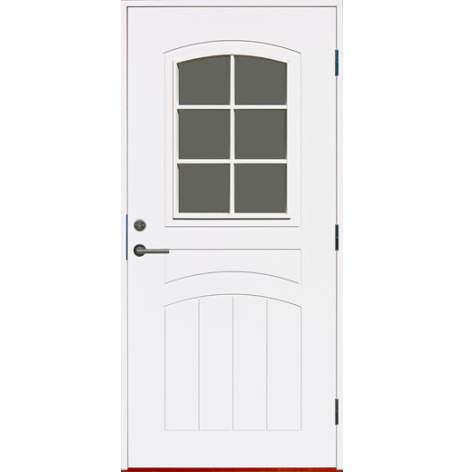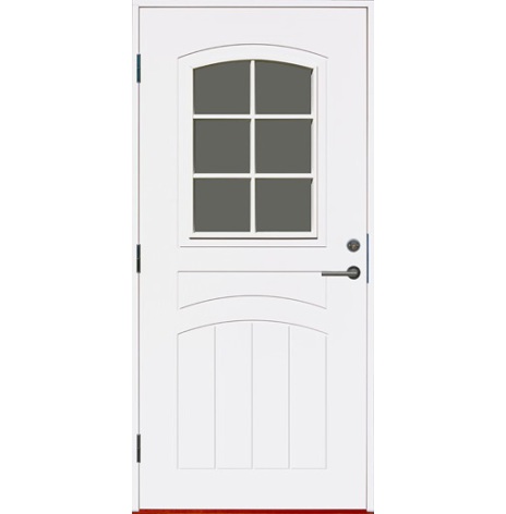 Dörren har ett spårfräst mönster på utsidan med slät insida. Stomme i furu med fyllning av 55 mm polystyren. Aluminiumplåt på bägge sidor för bra formstabilitet och vitmålad HDF-board (3,2 mm) som ytskikt. 3 st justerbara gångjärn med bakkantssäkring. Levereras med låskista Assa 8765 och justerbart slutbleck.Tjocklek på dörrblad 62 mm. Färdigmonterad karm i vitmålad furu 42x92 mm med handikappanpassad tröskel och förborrade karmskruvshål. OBS: Karmskruv ingår ej.