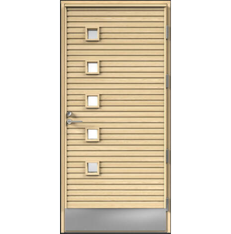 Dörrarna är klädda ut- och invändigt med kvistfri, massiv furupanel och lasyrbehandlade i valfri standardkulör. Levereras utan beslag. U-värde från 0,71.