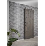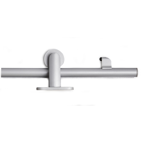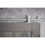 Komplett skjutdörrsbeslag av silverlackerad aluminium.