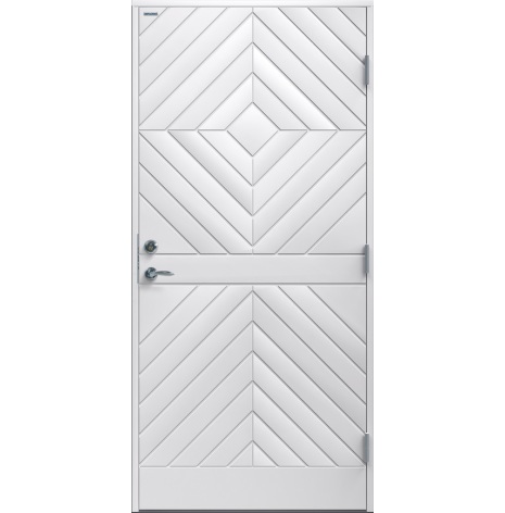 Karin tät är en ttterdörr i traditionell stil med diagonal panel i form av spårfräst dekor. Välj mellan valfri kulör eller furu. Insidan är slät.