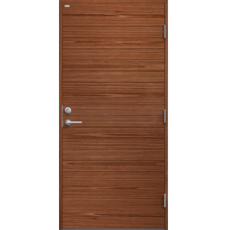 Ingela tät Teak är en ytterdörr i modern stil med spårfräst dekor i form av liggande panel i konstteak. Insidan är slät, men går att få dekorerad som utsidan.