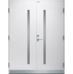 Mikaela är en parytterdörr i modern stil med slät yta helt utan dekor. Smalt, stående klarglas och rostfri sparkplåt. Dörr och karm levereras vit NCS S 0502-Y som standard.