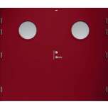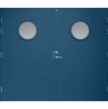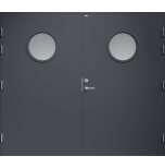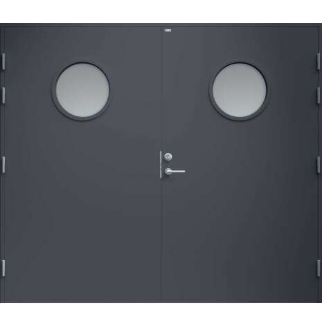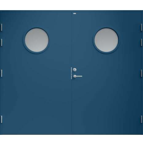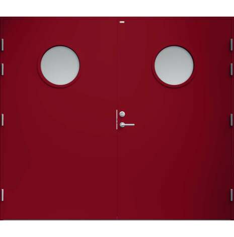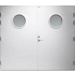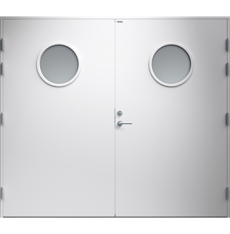 Garagedörr med helt slät yta utan dekor och två runda klarglas. Som standard är dörren Vit (NCS S0502-Y).