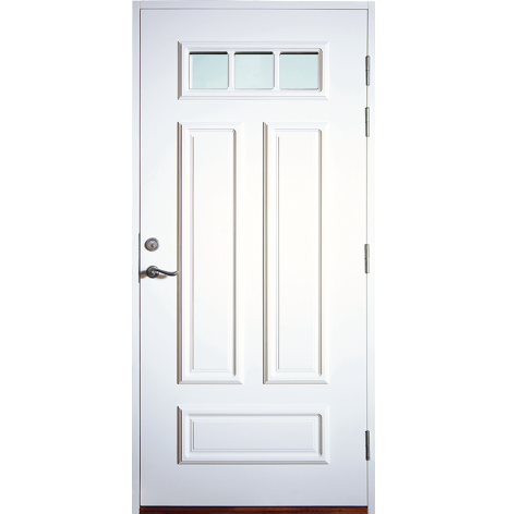Dörrarna i Herrgårdsserien tillverkas med kraftigt ramträ för bästa stabilitet, har 4 kraftiga justerbara gångjärn med bakkantssäkring och kraftig tröskel med slitskena av aluminium. Standard låskista är Dorma DL 91925 motsv. funktion som Assa 2500 med bortasäkring (hakregellås). 3 lager färg för bästa finish och slitstyrka.