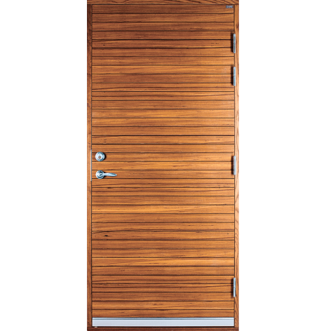 Ek/Teak-serien tillverkas i 3 varianter, slät, spårfräst och med pålimmade speglar i massiv teak eller ek. Alla dörrar har slät insida med stående ådring. Salningsspår är standard. Ek och Teakdörrar rekommenderas sitta i skyddat läge för att minska underhållet.