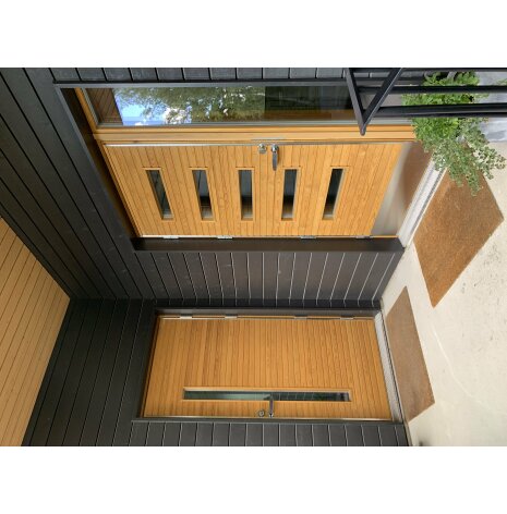 Dörrarna är klädda ut- och invändigt med kvistfri, massiv furupanel och lasyrbehandlade i valfri standardkulör. Levereras utan beslag. U-värde från 0,71.